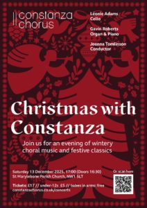 Constanza Chorus is a choral society based in the City of London and started in 2010. We’re a large and sociable choir whilst striving for musical excellence, led by charismatic conductor Joanna Tomlinson.